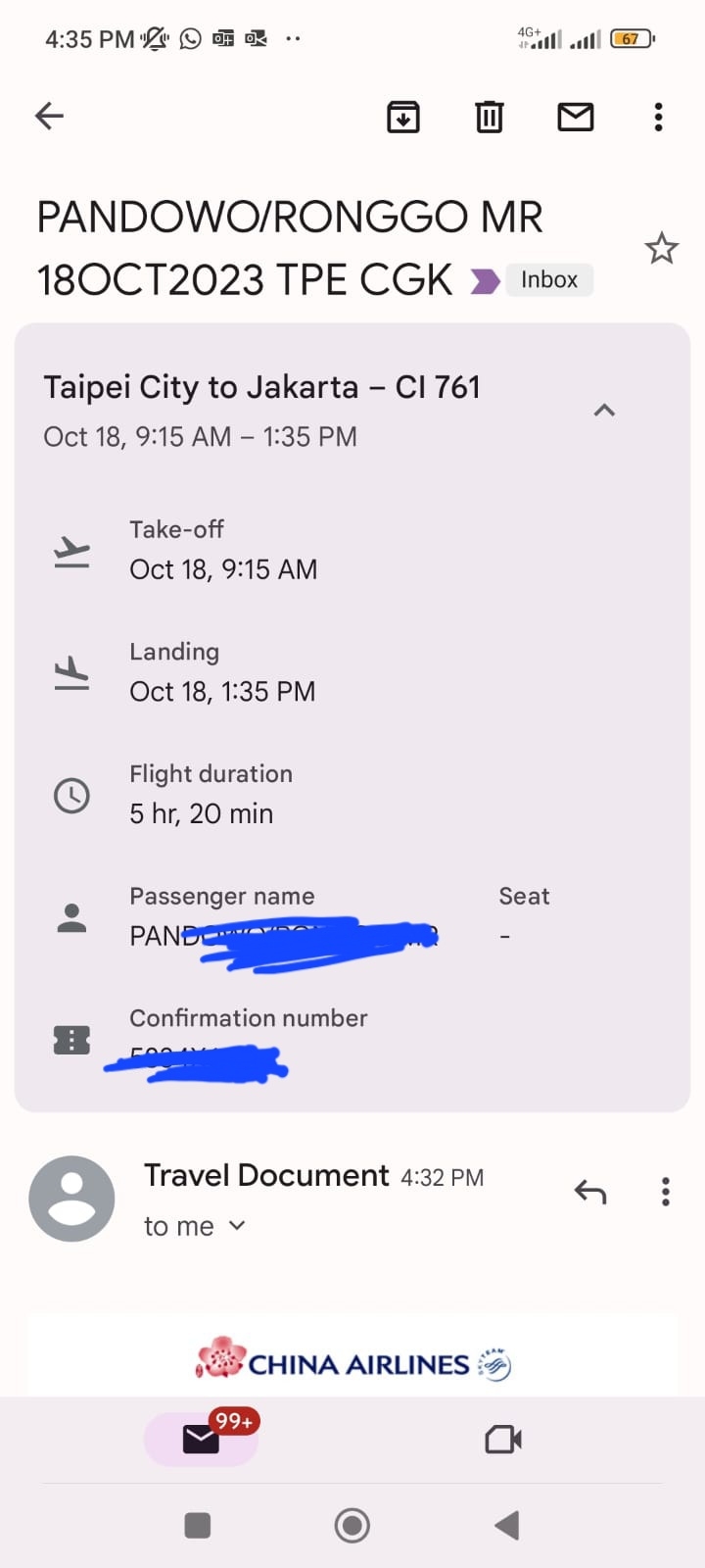 Email ke China Airlines eeeh disuruh urus ke aplikasi tempat kami membeli. Akhirnya saya telfon China Airlines Jakarta sebanyak 3x.